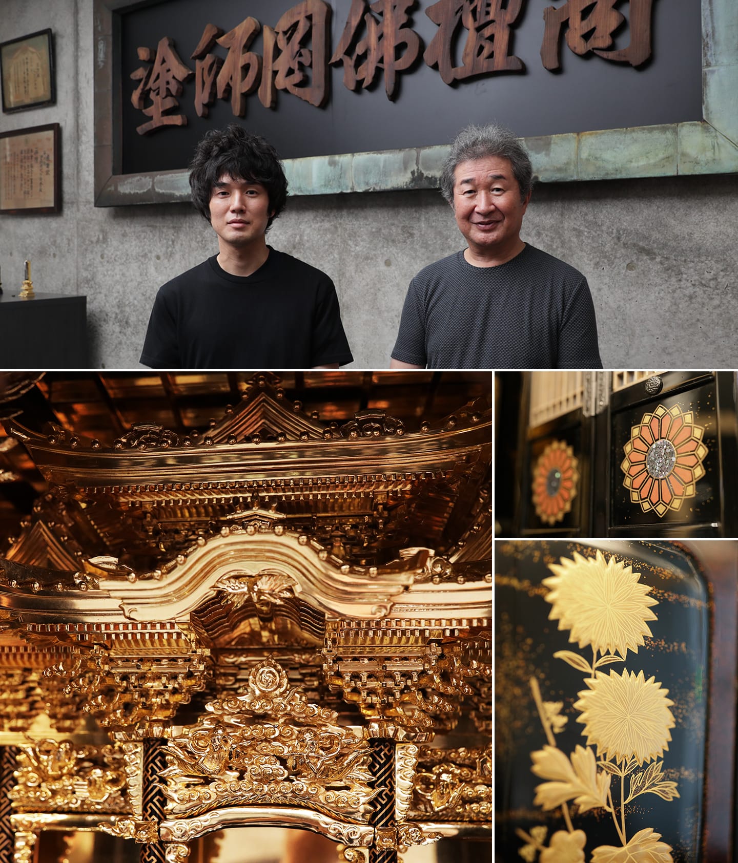 私たちは、⼗七代⽬塗師「塗師岡 政秀」と⼗⼋代⽬塗師「塗師岡 聖治」が継承する技の全てで世界にひとつ、ここにしかない⾦沢仏壇をいちからオーダーメイドでお作りしています。
