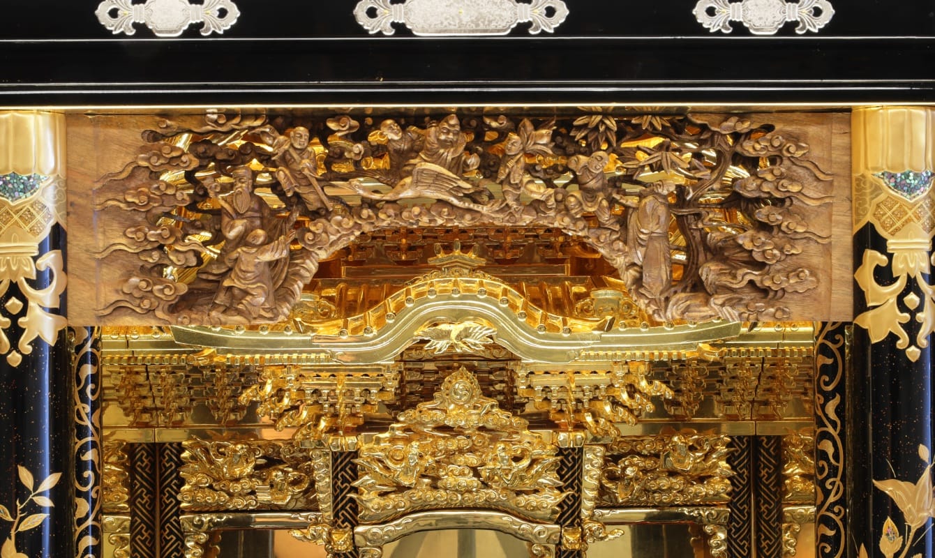 金箔や螺鈿などの豪華絢爛な装い、 人の手による温かみのある木彫り・金具細工、 やさしく華やかな蒔絵、 厳かで気品漂う漆細工など、 その全ては北陸の人々の祈るこころや思いが形を成し、 現在の金沢仏壇として産み出されたのだと考えます。