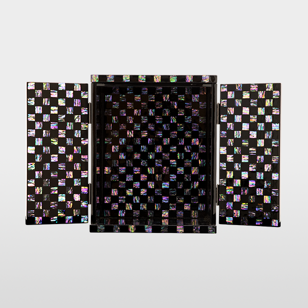 天井、側面、戸表、そして中の下段には市松模様で螺鈿塗りを施しています。中は全体的に朱の漆塗りで仕上げています。扉を閉めると市松模様が繋がるようになっています。
