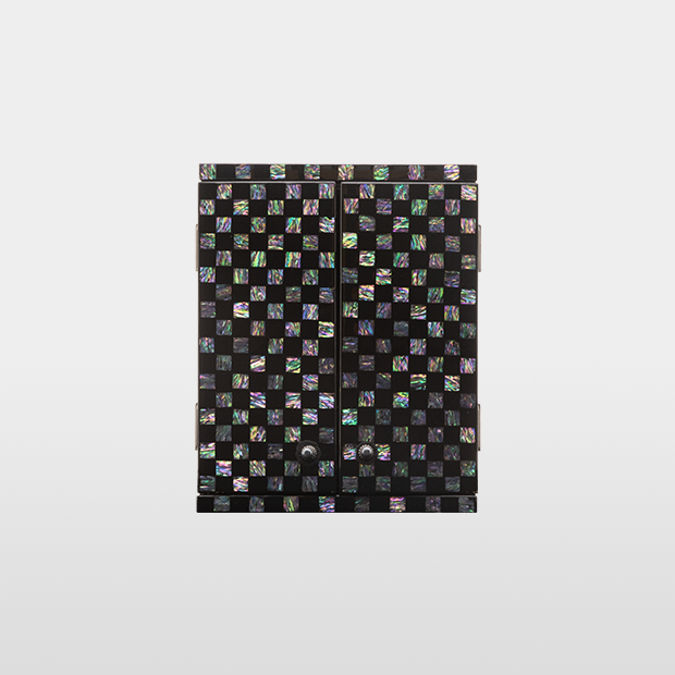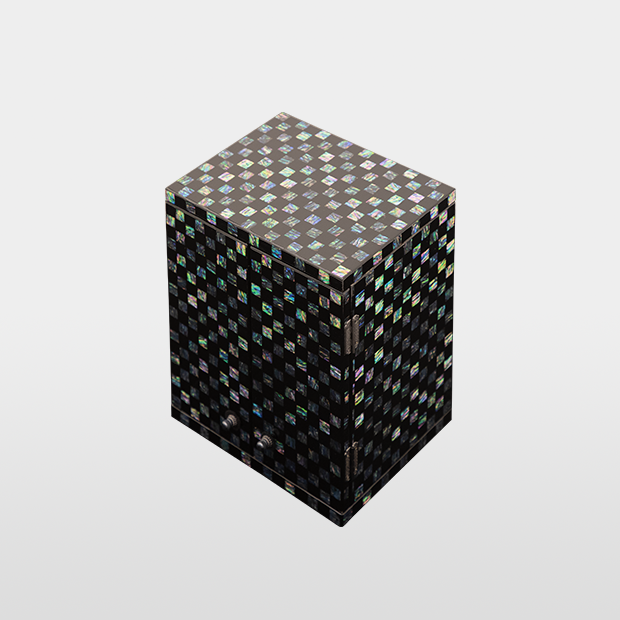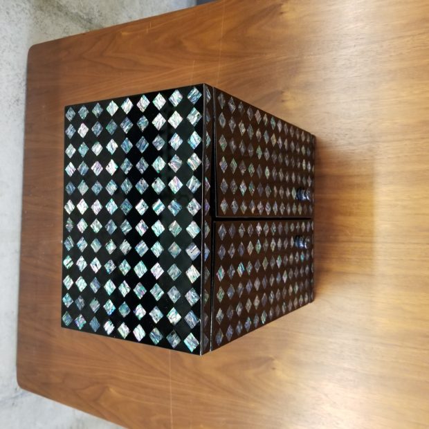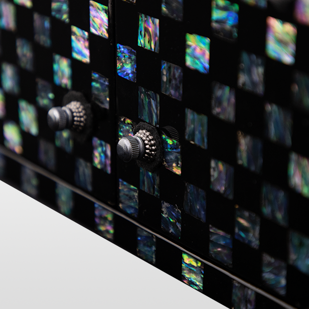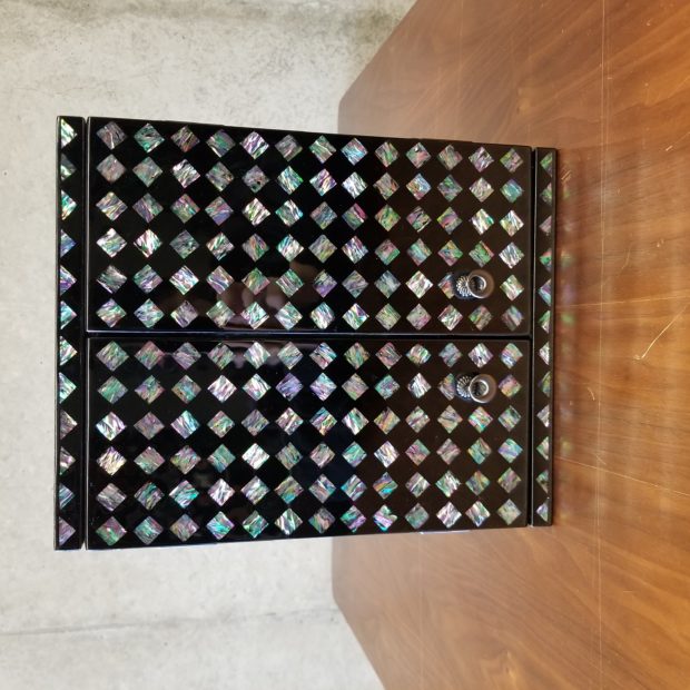 全体にダイヤ柄模様の螺鈿塗り仕上げになっています。戸裏には青貝箔を使い、螺鈿の色合いに合うように仕上げました。