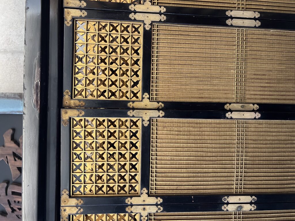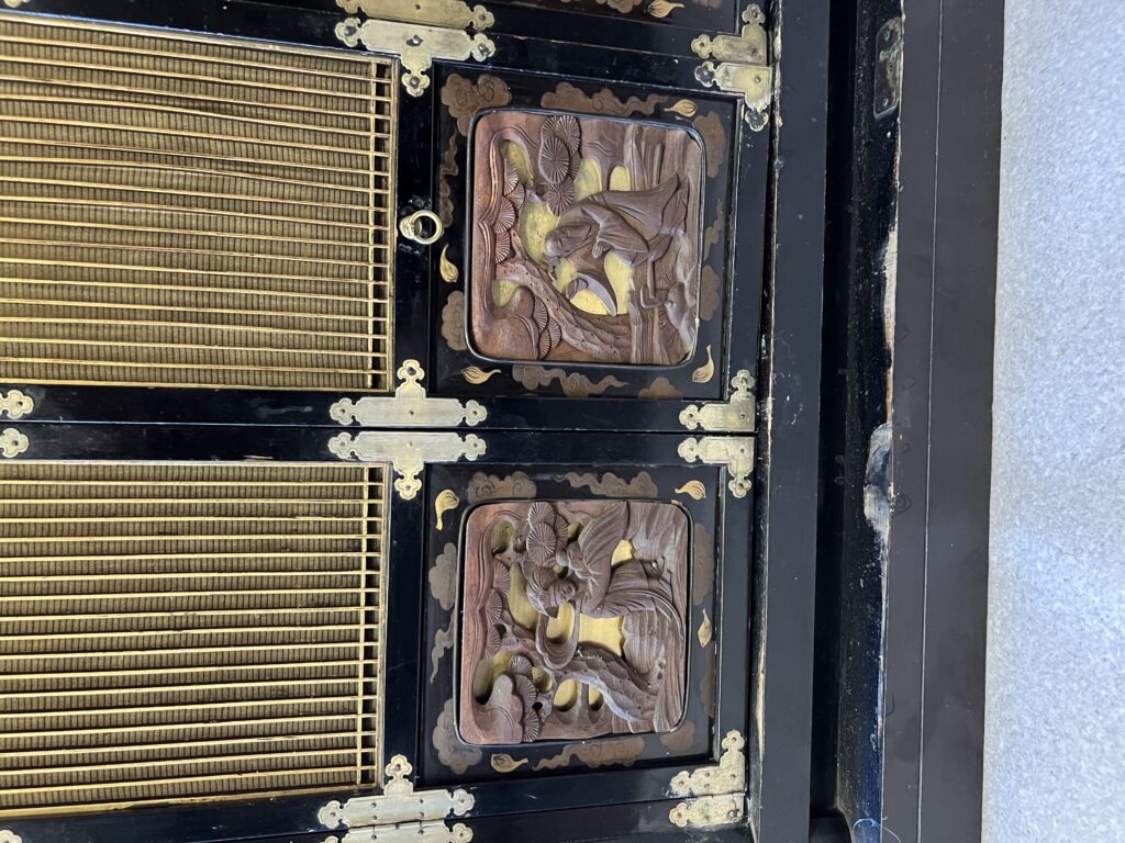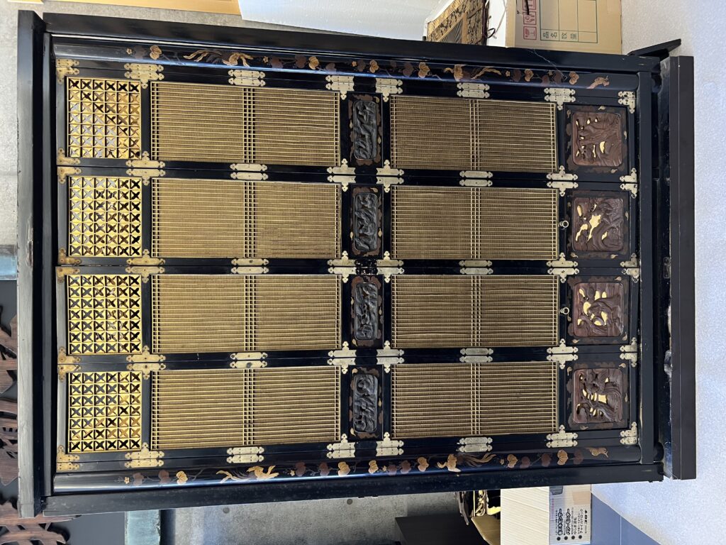 以前お参りしていた大きさが200代の仏壇の彫刻を使い、扉を作製しました。もともと仏壇に使われる障子を扉にデザインした型です。3、4、5枚目の写真の仏壇が以前お参りしていた200代の仏壇です。