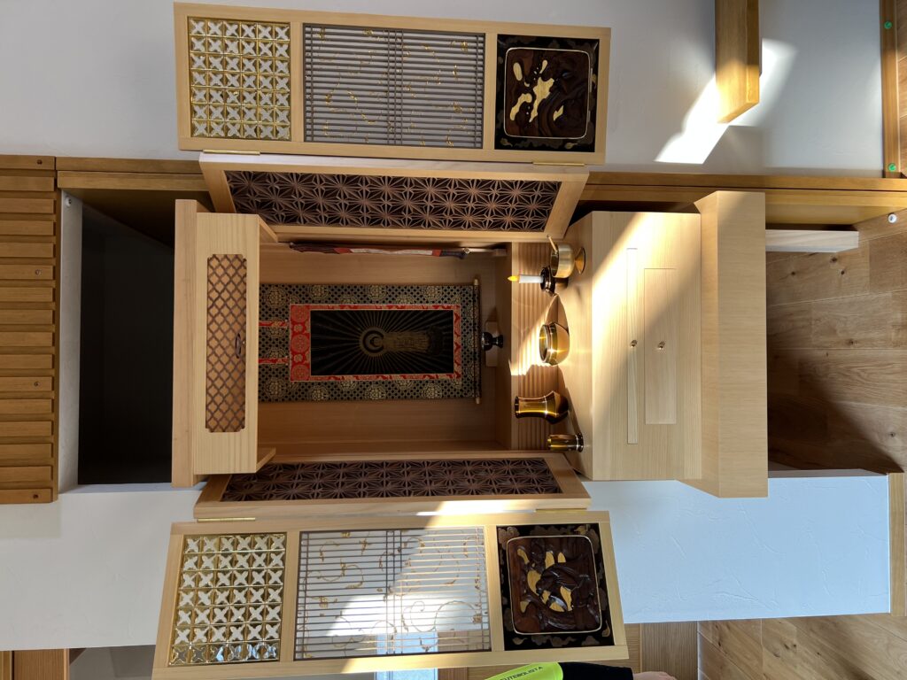 お客様とご相談しながら仏壇のデザインを決めていきました☀️仏壇全体の木地に能登ヒバを使用し、無垢のまま仕上げました。組子にはウォールナットを使用しました。