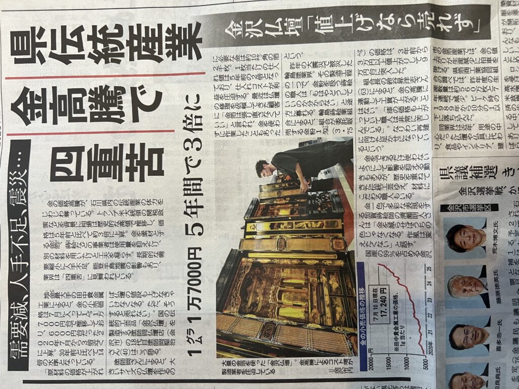 今日の北國新聞に掲載されました✨内容は金の高騰についてですが、大きく仏壇の写真が載りました。