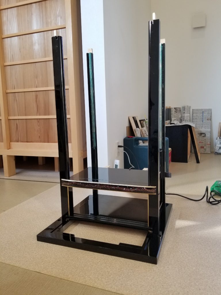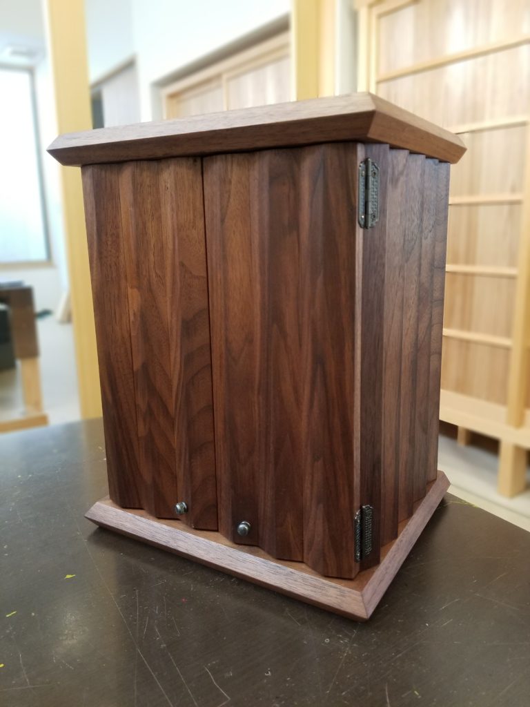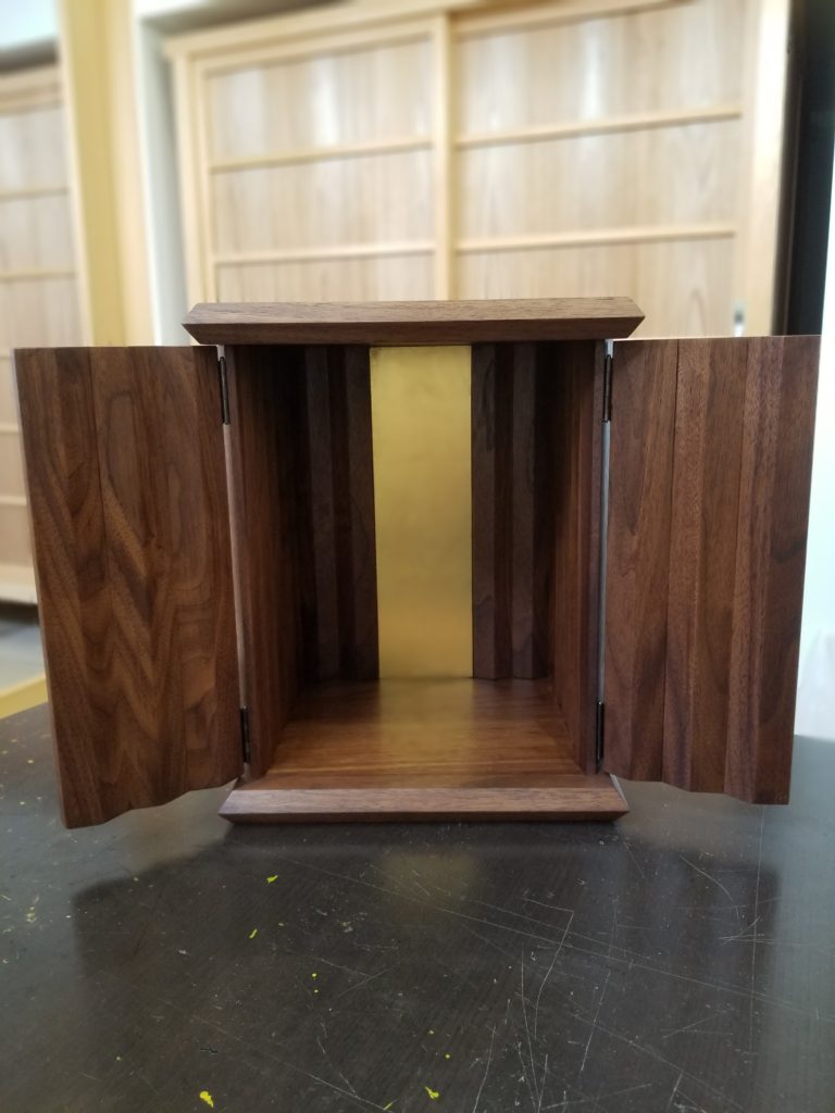 寸法は幅28cm、高さ35cm、奥行き23cmです。全体に拭き漆仕上げで、三付板の中心部分に艶消しの箔押し仕上げにしました。扉や外、内側には三角の凹凸模様にデザインしました。今回はシンプルに仕上げました。