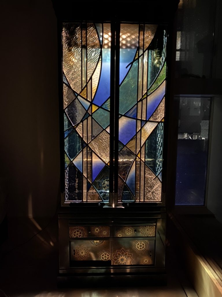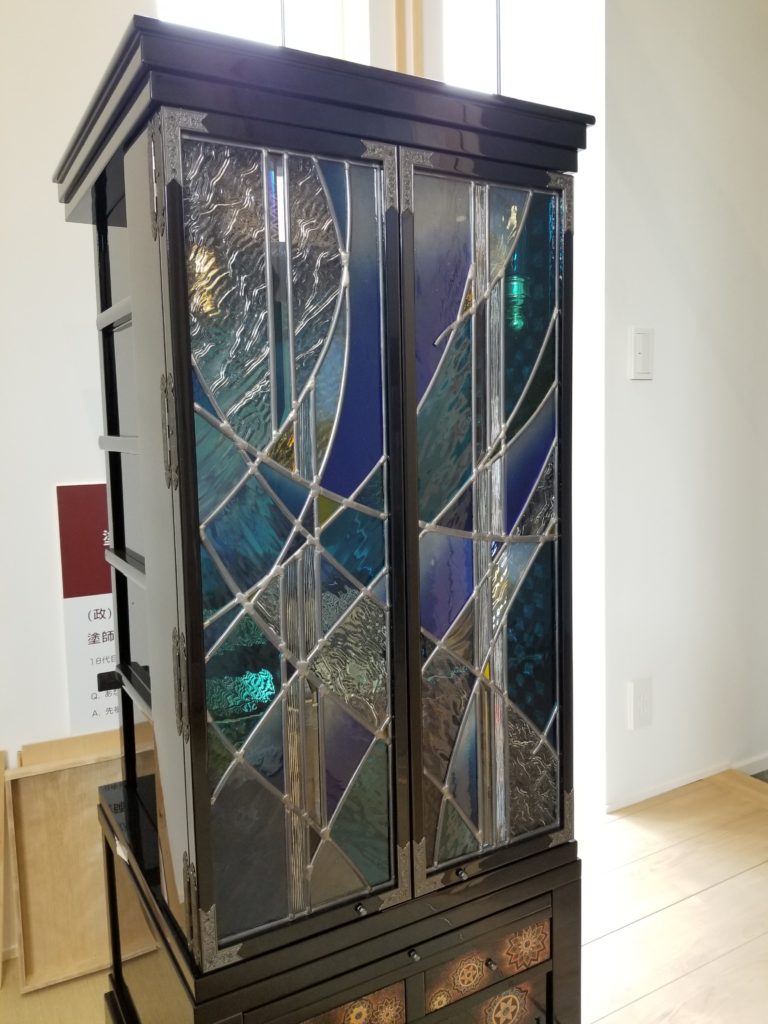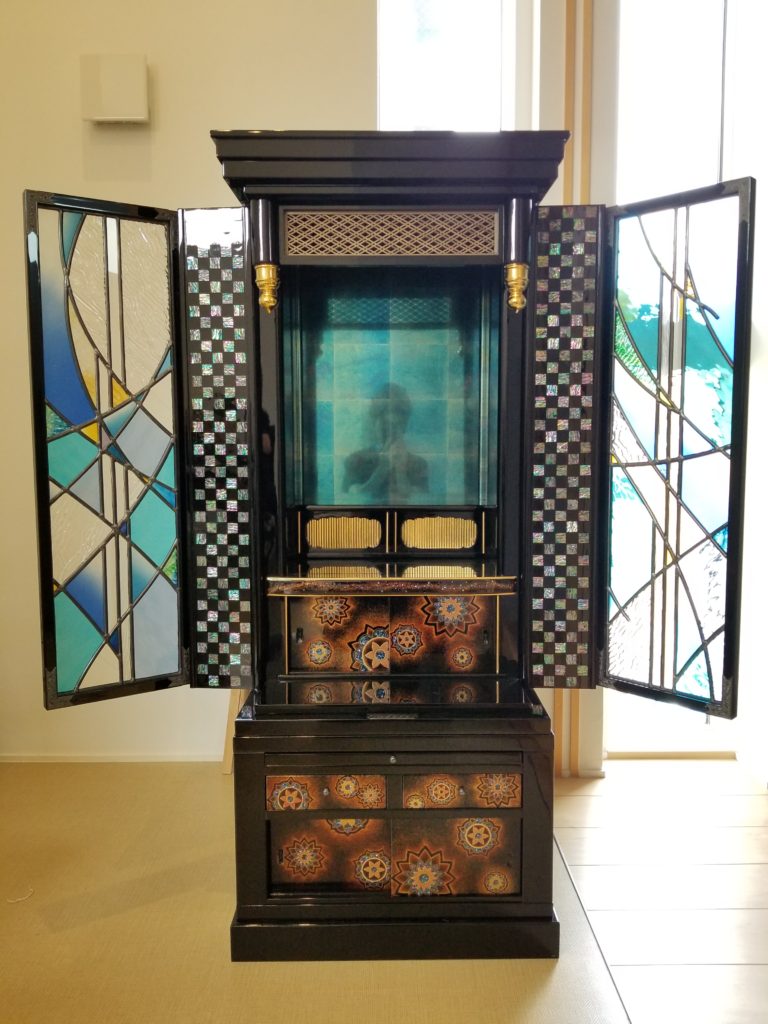 扉にはステンドグラスを使用し、螺鈿に合うよなデザインにしました。