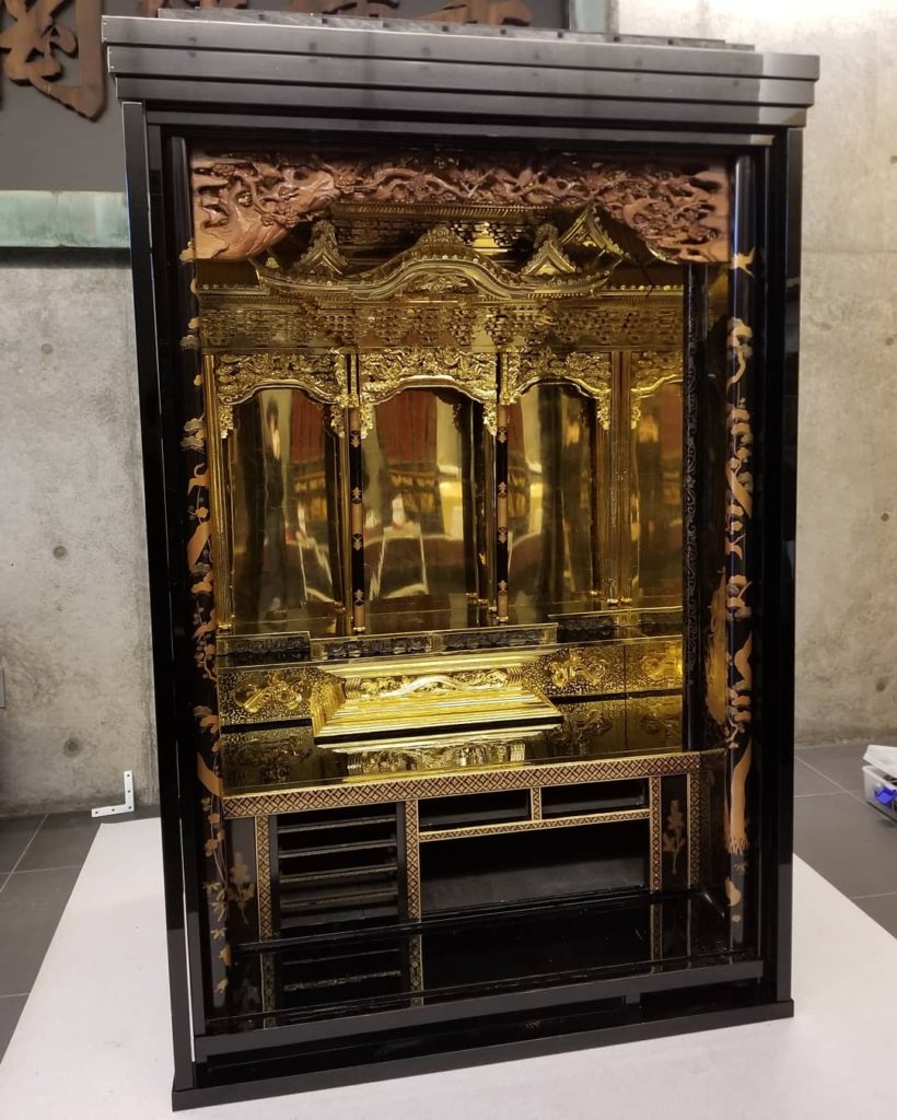 木地は虫食いや傷があり、かなりダメージがあった所は新しく木地を取り替えました。そして漆は全部塗り替え、金箔も全部置き直し、修理しました。新品同様になりました。