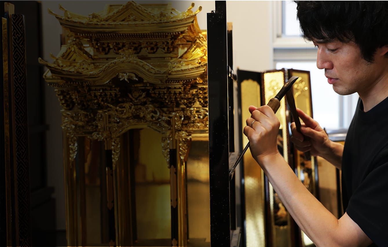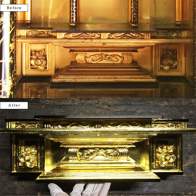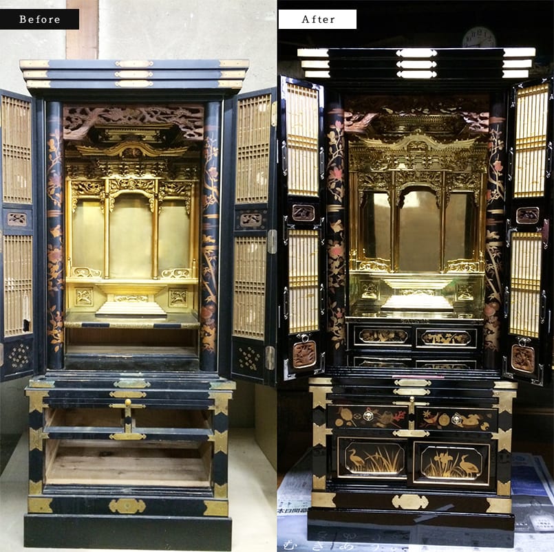 仏壇の扉、台などのかすんだ漆、剥がれ落ちた金箔、黒ずんだ金具など古くなった仏壇を(政)塗師岡仏壇店の塗師職人が一から手作業で洗い・修復を行います。
