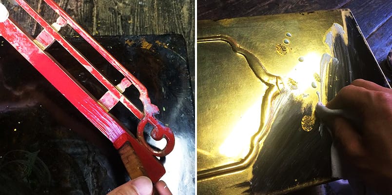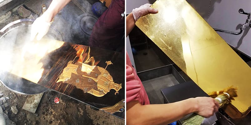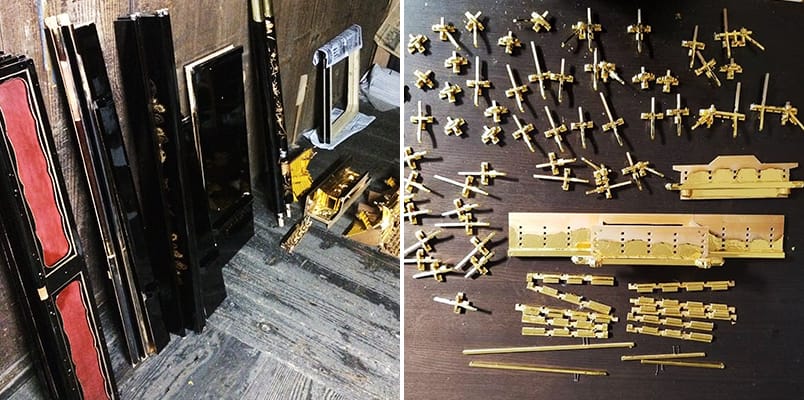 修復漆が薄くなり艶がなくなった部品は洗いの工程で剥がし、塗り直します。部品の表面が均一になるまで研磨し、下地漆を塗り込んでいきます。この工程を何度も繰り返し行い、中塗りから上塗りへと塗り上げ、光沢を蘇らせます。剥げてしまった金箔も洗いの工程でキレイに剥がします。箔下漆を塗った部品にムラなく均等に金箔を一枚一枚押していき、箔押しの後も十分に乾燥させます。
